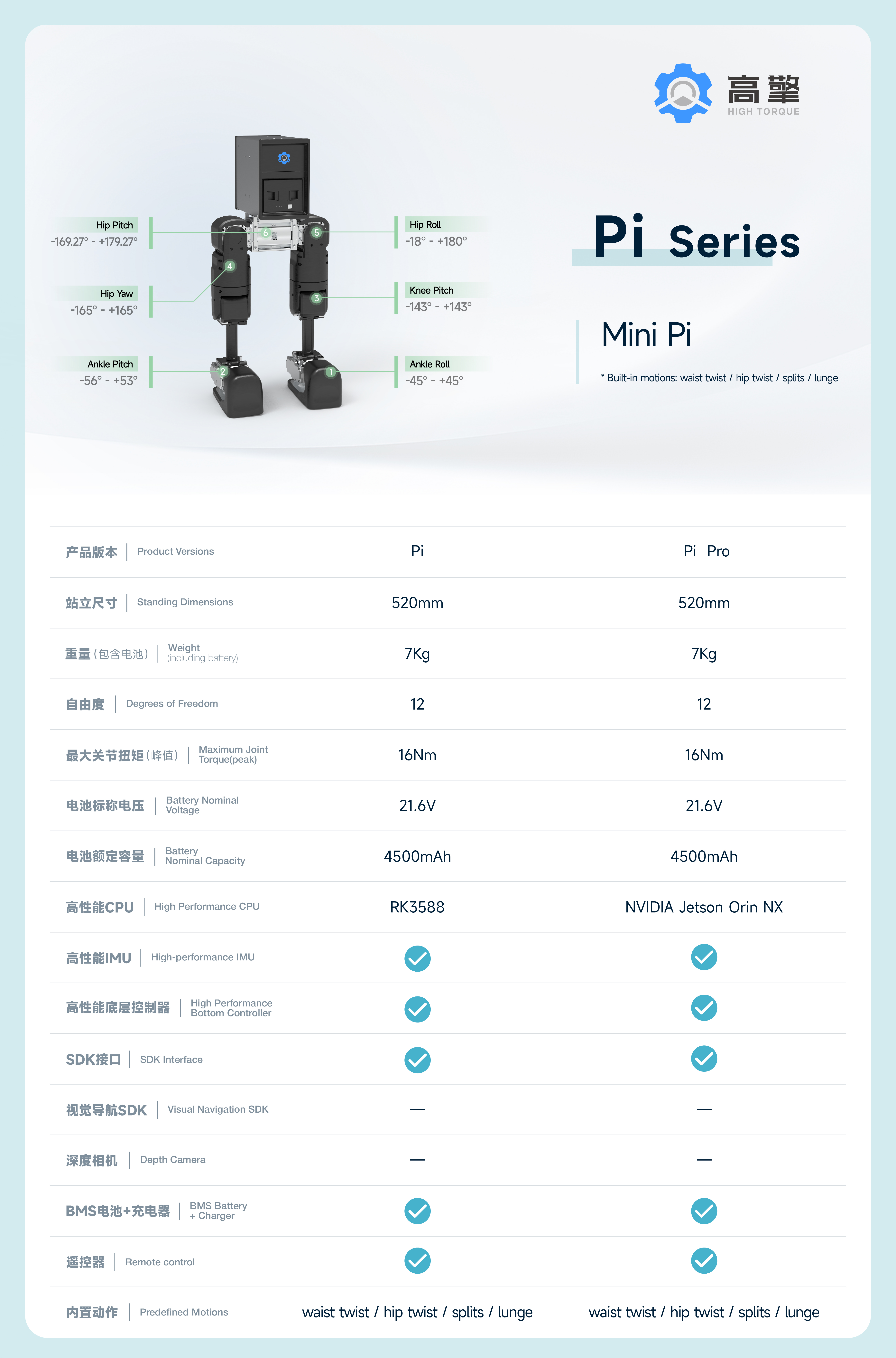 The cool black and white color scheme, along with the metallic luster of the shell, adds a greater sense of technology to the mini π. With a height of 590mm and a total weight of 7kg, this robot is lighter. It can be easily picked up with one hand by an adult, making it more convenient for development.